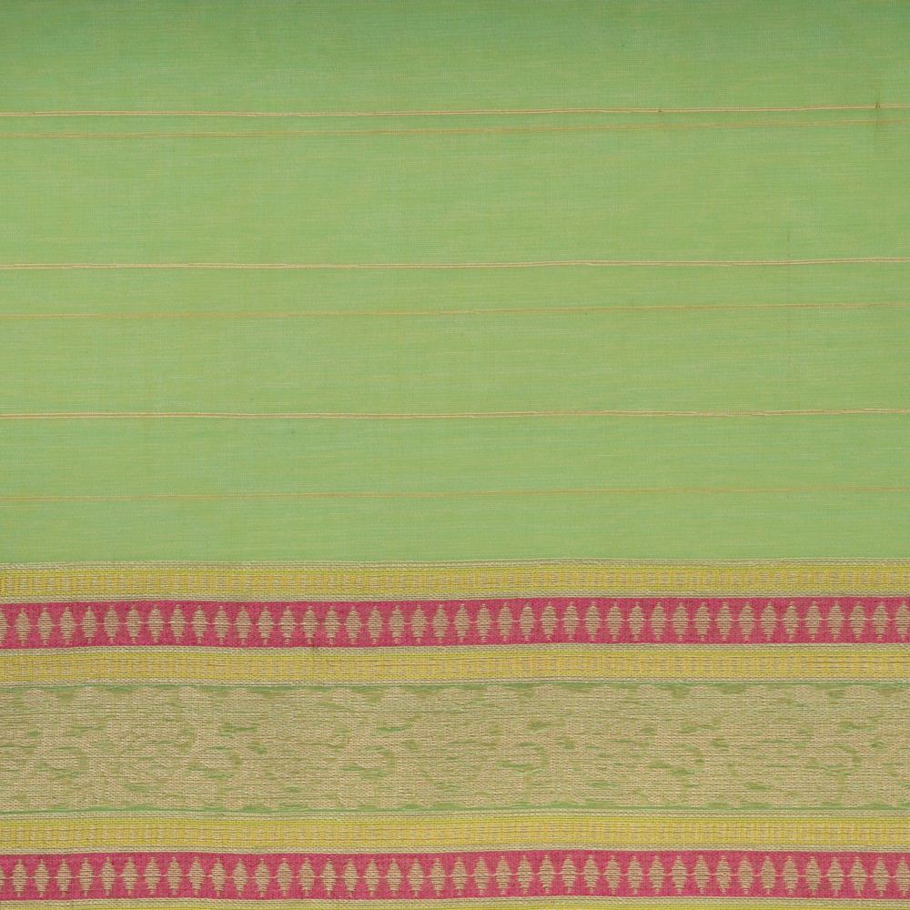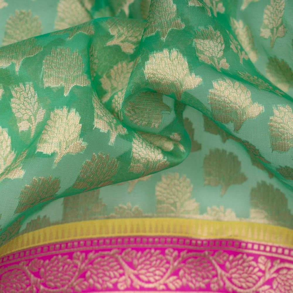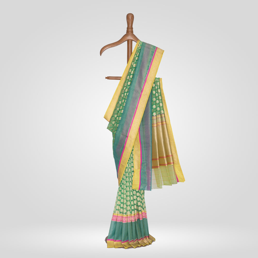 Alizeh Kora Silk Saree with all over gold zari floral motifs and a latar of florla border complemented with zari checks with a subtle play of colours from persiian green to pink.