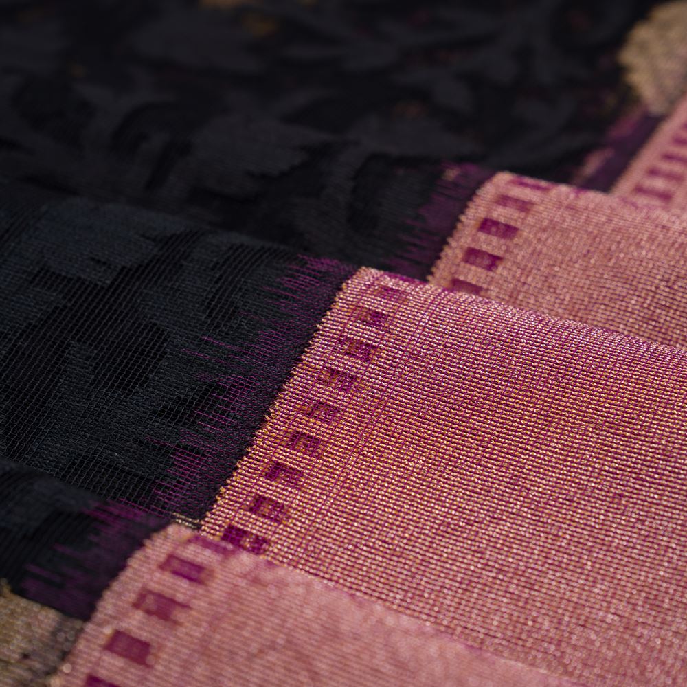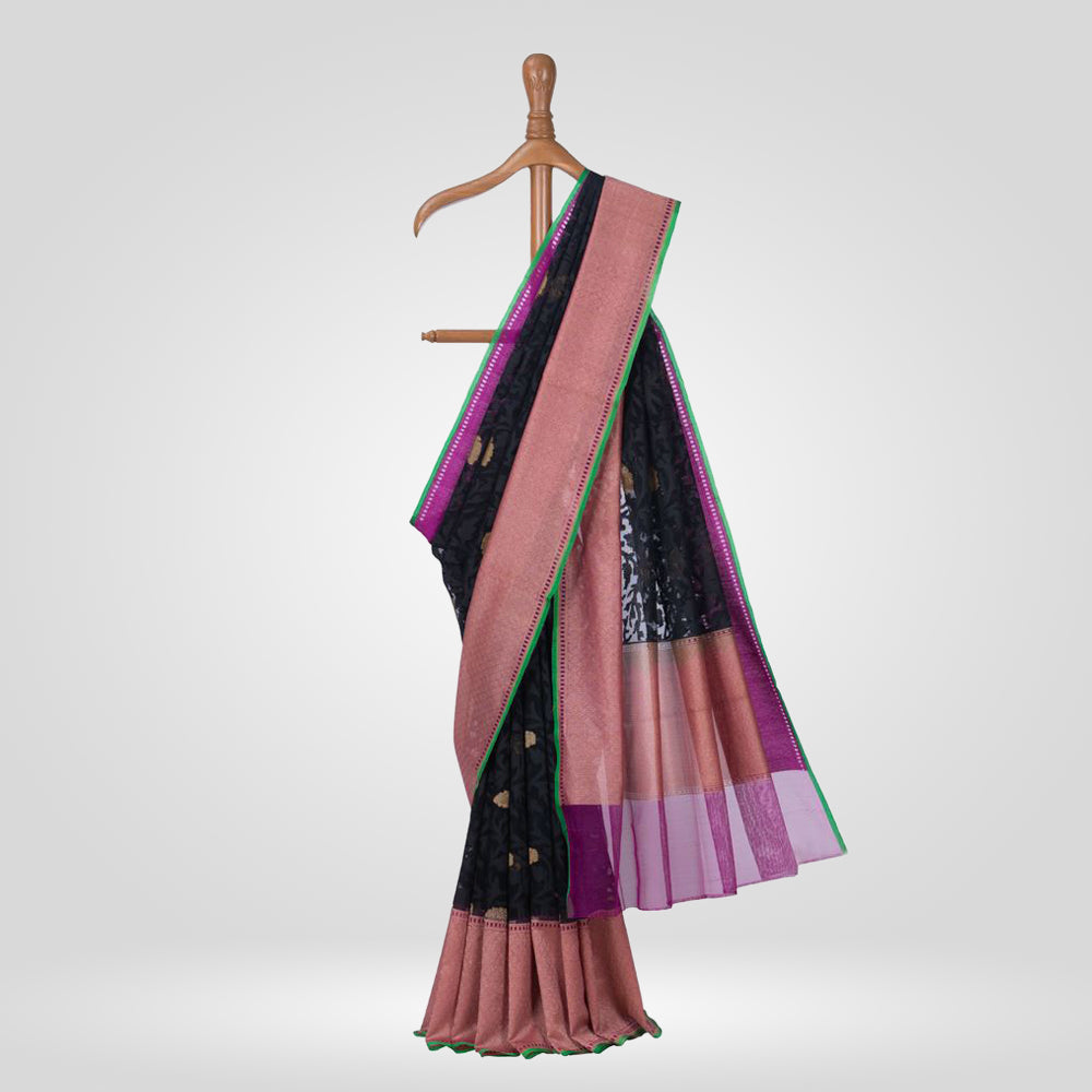 Angoori, a florescence of grapes on a Black Banarasi Handwoven Kora Net Saree with a grape wine colour border interlaced with understated zari, this saree is light weight and stylishly sheer.