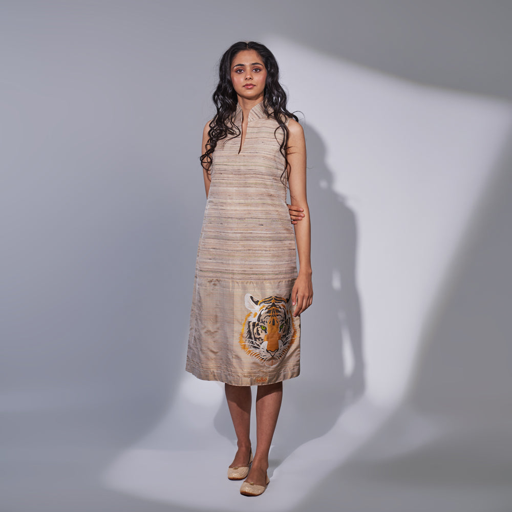 Weaving Technique: Nakshi Kadhwa handwoven on pit-loom using 3500 punched cards for the Tiger Face, the fearsome majestic on the avant-garde Banarasis. To achieve the base texture that harkens to the forest grasslands of India, the weaver has used the dexterity of his eye and hand lifting / shedding the warp yarns randomly and delicately. No two lengths of Chakradhara are identical just like no two tigers have the same stripes or marks.