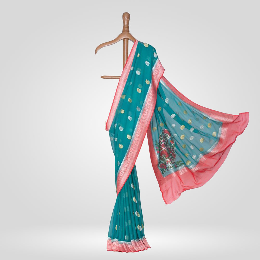 Badami, Paisley motif or boteh etched in resham and zari on a Teal Blue Banarasi Chiffon Saree with a carrot pink border is inspiration from a signature Jamewar from Kashmir.