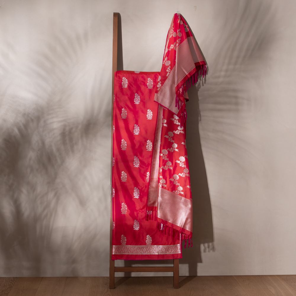 Bulbul Fiery Red Banarasi Handwoven Unstitched Silk Suit Set with Kadhwa zari buti and borders. Dupatta in Jungla Bel.