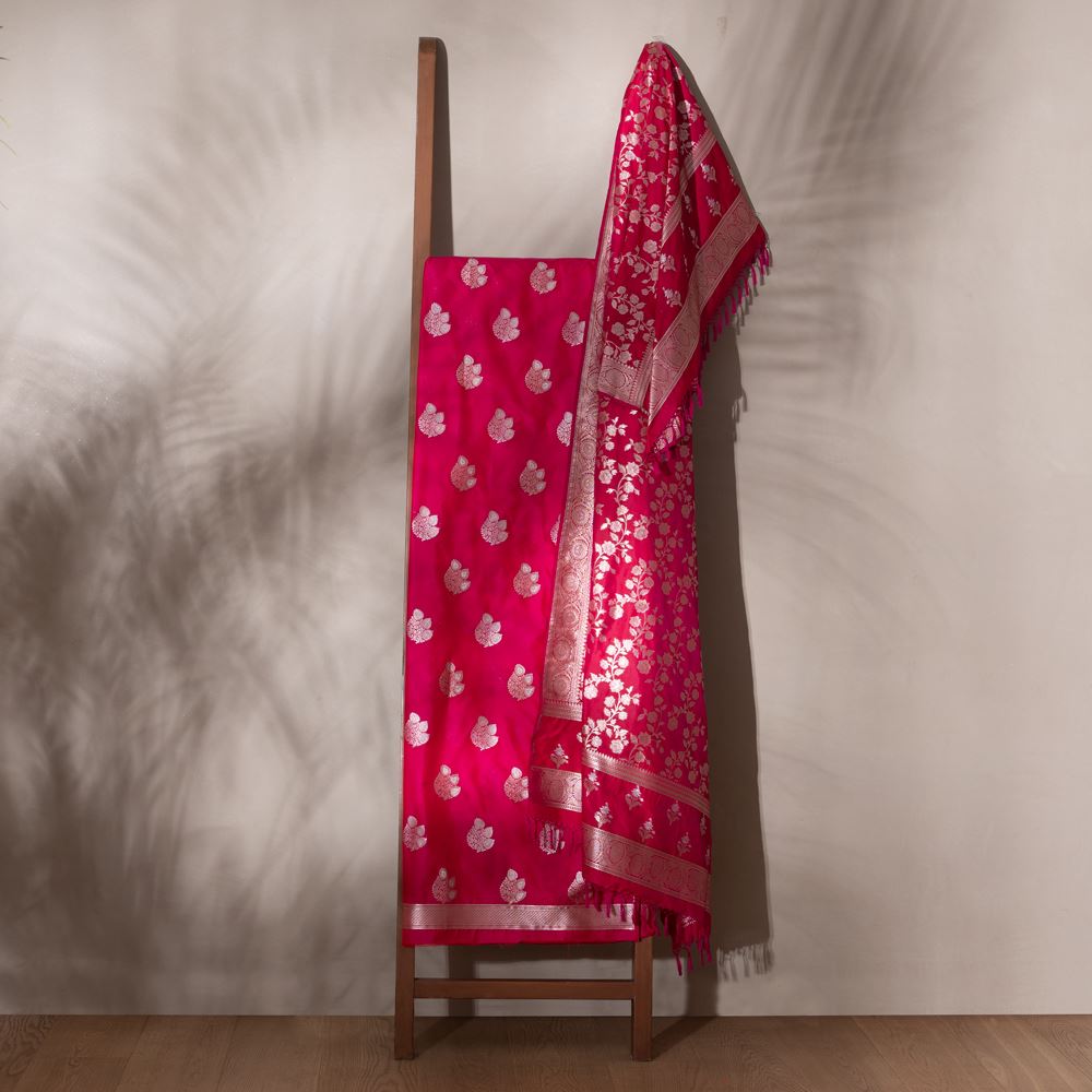 Bulbul True Red Banarasi Handwoven Unstitched Silk Suit Set with Kadhwa zari buti and borders. Dupatta in Jungla Bel.