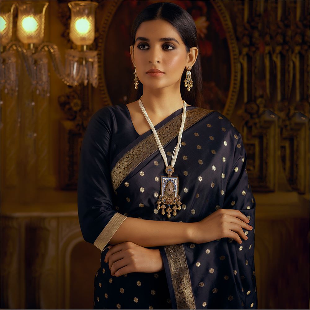 The Chunri Buti Banarasi saree is a delicately handwoven magical embossed zari buti akin to a button daisy on a fine mulberry or katan silk. A charming and feminine ode to nature and its abundance in black.