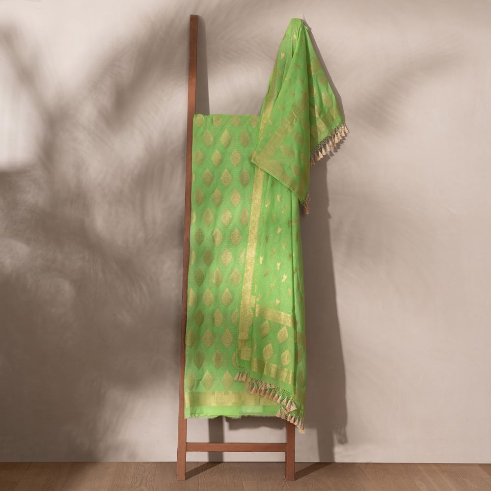 Jugni Bright Lime Banarasi Handwoven Unstitched Cotton Suit Set with gold zari guldavari buti