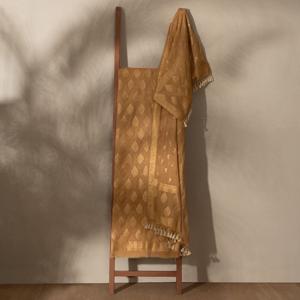 Jugni Hazel Nut Banarasi Handwoven Unstitched Cotton Suit Set with gold zari guldavari buti