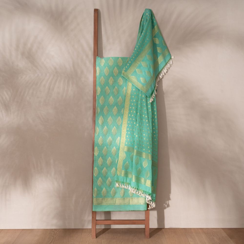 Jugni Jade Banarasi Handwoven Unstitched Cotton Suit Set with gold zari guldavari buti