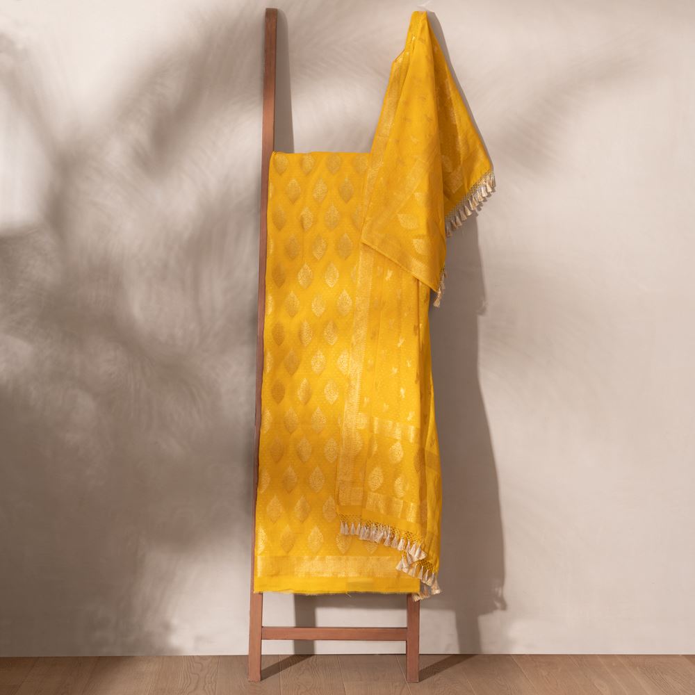 Jugni Mustard Banarasi Handwoven Unstitched Cotton Suit Set with gold zari guldavari buti
