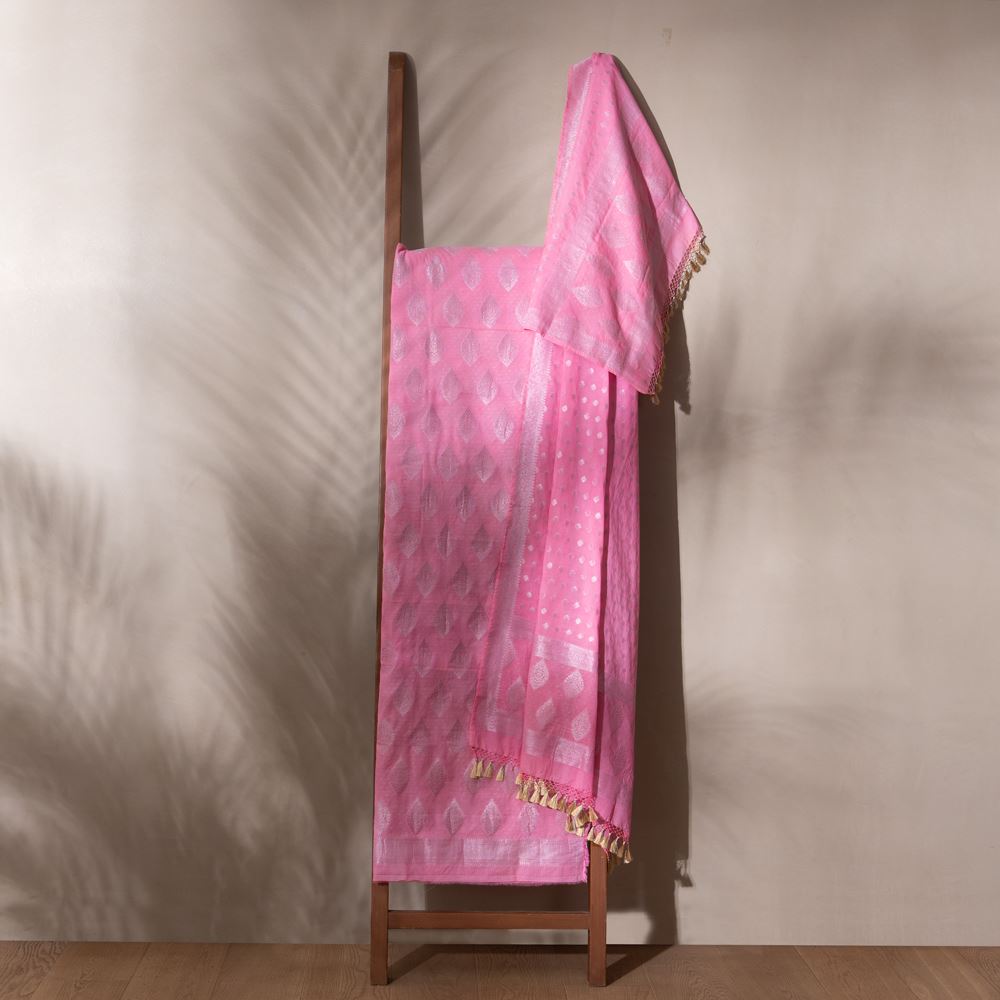 Jugni Strawberry Cream Pink Banarasi Handwoven Unstitched Cotton Suit Set with gold zari guldavari buti