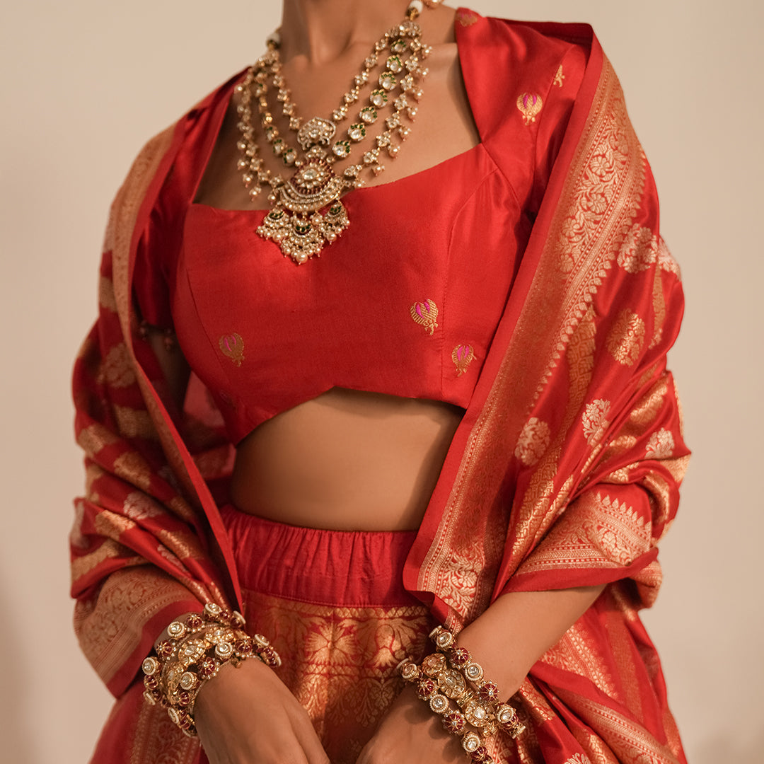 Ideal for a bride and her trousseau, Banarasi Lehenga Khinkhaab is a collectible and a de rigeur for her wedding. The decadent ‘Khinkhwab’, which literally translates into ‘a golden dream’ or the ‘Guldavari’, the most romantic floral weave, oh-so-glamourous Brocade, this weave is truly one of the first and last words when it comes to bridal couture in India. It celebrates India’s passion for artisanal luxury and handcraftsmanship like no other. A jewel in itself, that can take months to weave, it doesn’t get more glamorous than a silk Khinkhaab lehenga with brilliant floral patterns and dramatic Mughal motifs woven in gold. Favoured by royalty through the ages across various cultures through the silk route, its bold and sheer opulence enthrals. Lehenga Khinkhaab is a must for every heirloom.