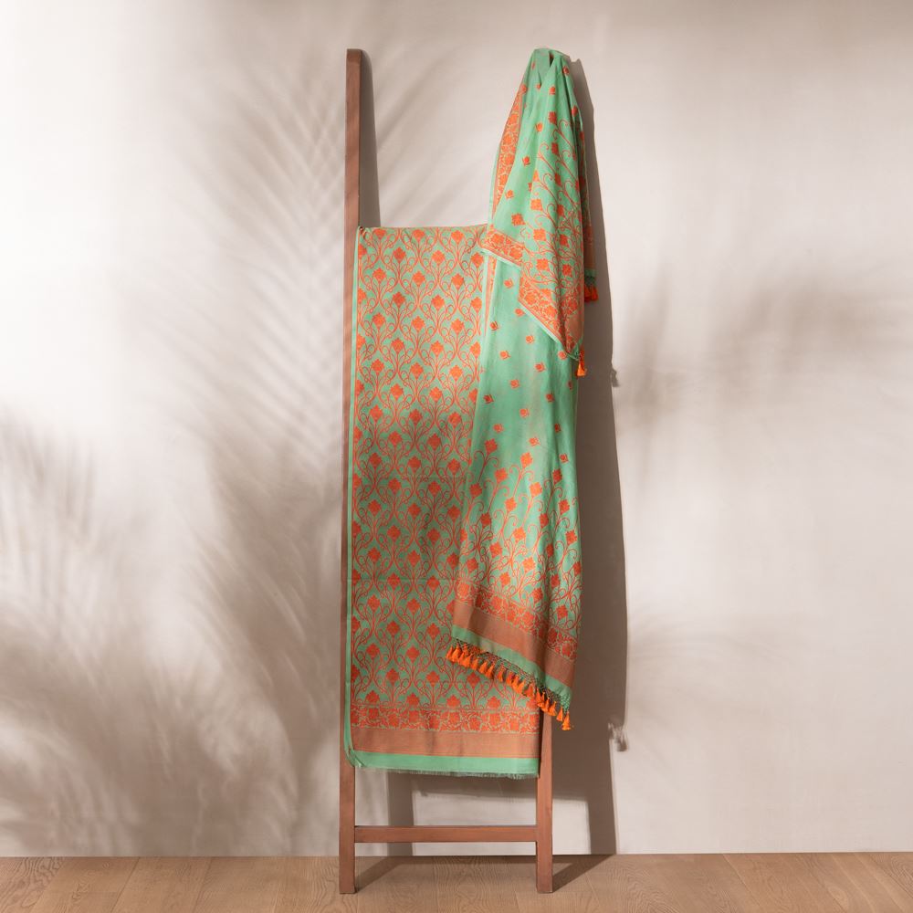 Kumud Banarasi Handwoven Cotton Suit Set Island Green and Orange