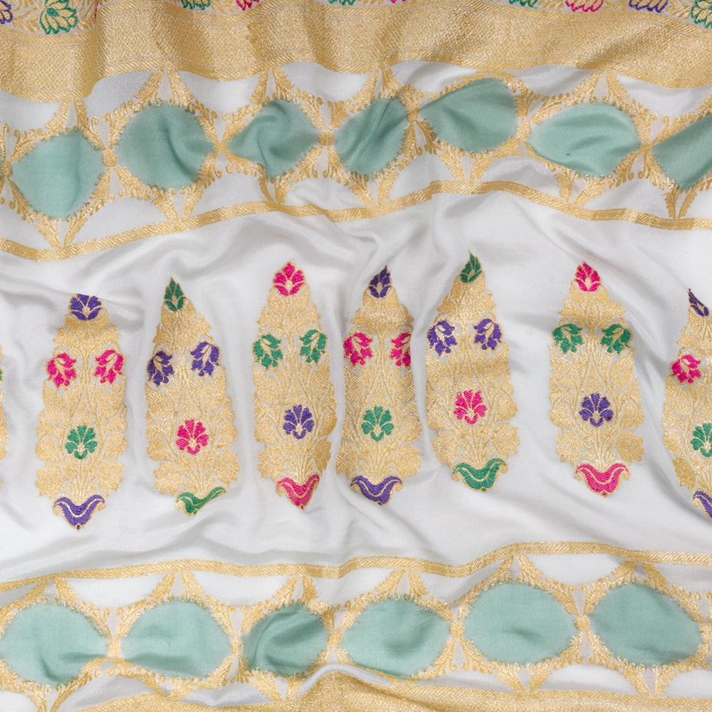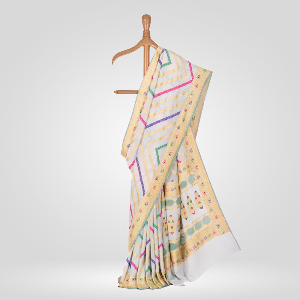 Mouje Lehar, a kadhwa minakari jungla in geometric zigzag pattern on an almost translucent Pista Silk Chiffon Banarasi Saree is a classic and a collector's delight.