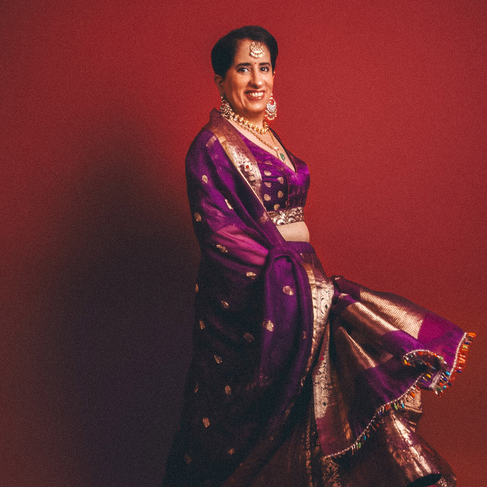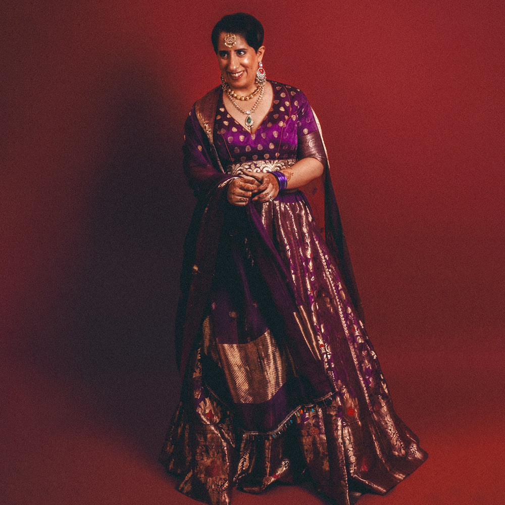 Shahbanu. The Queen of Queens. She stands in pure love and ecstasy of her consort. A celebration of the regal patronage and super rich cross-cultures, she is effortlessly charismatic. She is poised. She is powerful. She is aristocratic. She glitters in gold threads and coloured silks. Weaving calligraphy dotted from ancient to modern galleries, from Persian Princesses to Indian Maharanis. The flora and fauna of botanical patterns, floral arabesques and butas. Darya-e Nur invokes the nostalgia of empires of antiquity.
