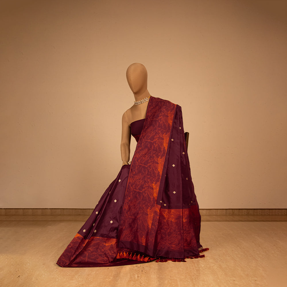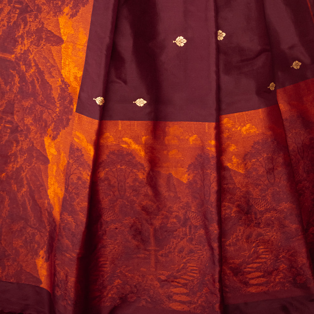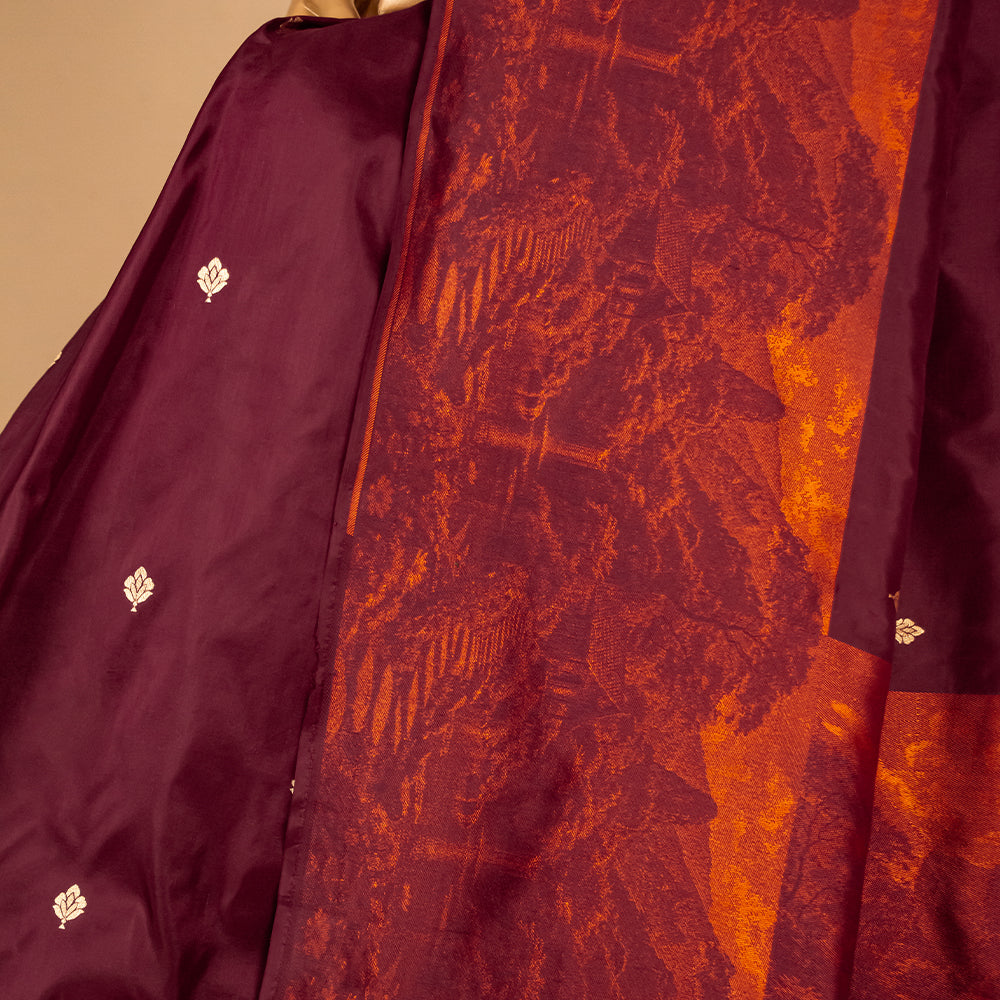 Shikhar Handwoven Banarasi Burgundy and Rust Silk Saree